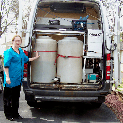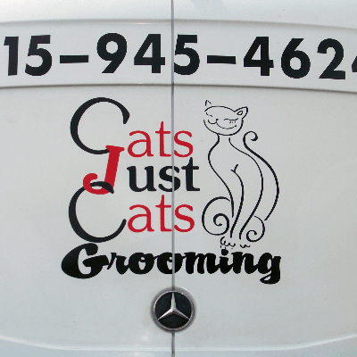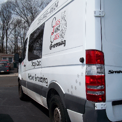 Cats Just Cats’ mobile grooming van comes fully equipped with all the equipment that a professional pet groomer needs. It has heat, air conditioning, and two 65 gallon water tanks in the van. One tank carries fresh clean water and one carries the waste water (used water). Your pet is always bathed with clean, warm water. I like to be eco friendly, so at the end of every day, I use the dirty water to water my own lawn. My van is self contained and gets cleaned before and after every pet grooming.